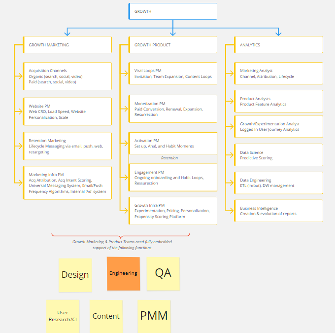 Growth teams are usually organized around the 3*3 matrix. For example, this is Elena Verna’s optimal growth org: