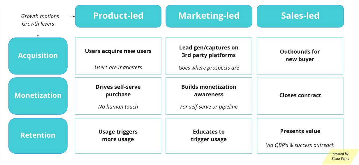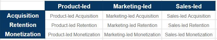 Elena Verna, growth guru, invented the 3*3 matrix with this B2B (business to business) example: