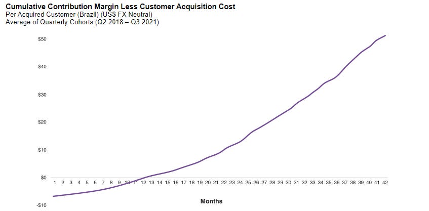 Apart from the north-star metric, all heads of growth should track the payback period (calculated as the time it takes a company to payback its Customer Acquisition Cost ‘CAC’). This is the bread and butter of sustainable growth. An example from Nubank’s IPO Prospectus (F-1), a payback period of 12 months: